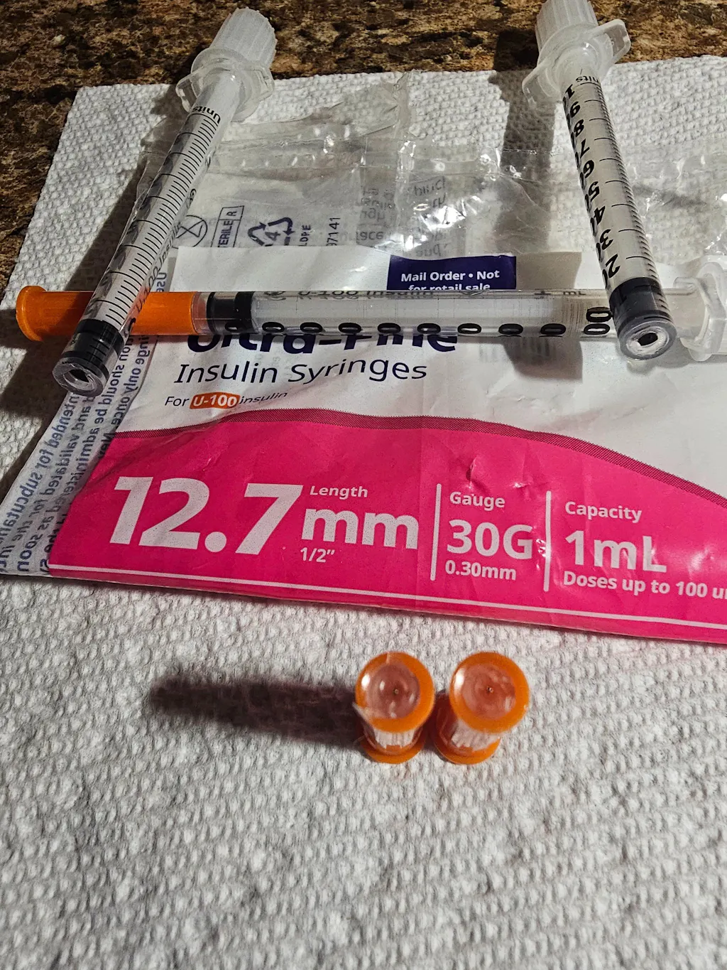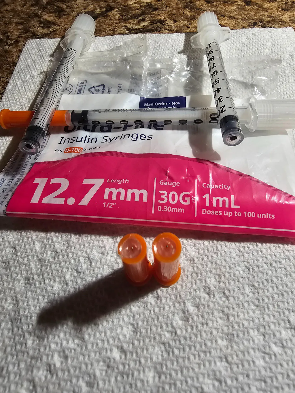 | 328431 | 30 G (0.30 mm) | 1/2 in (12.7 mm) | 3/10 cc (0.3 mL) | One-unit | 100 Syringes | Retail |